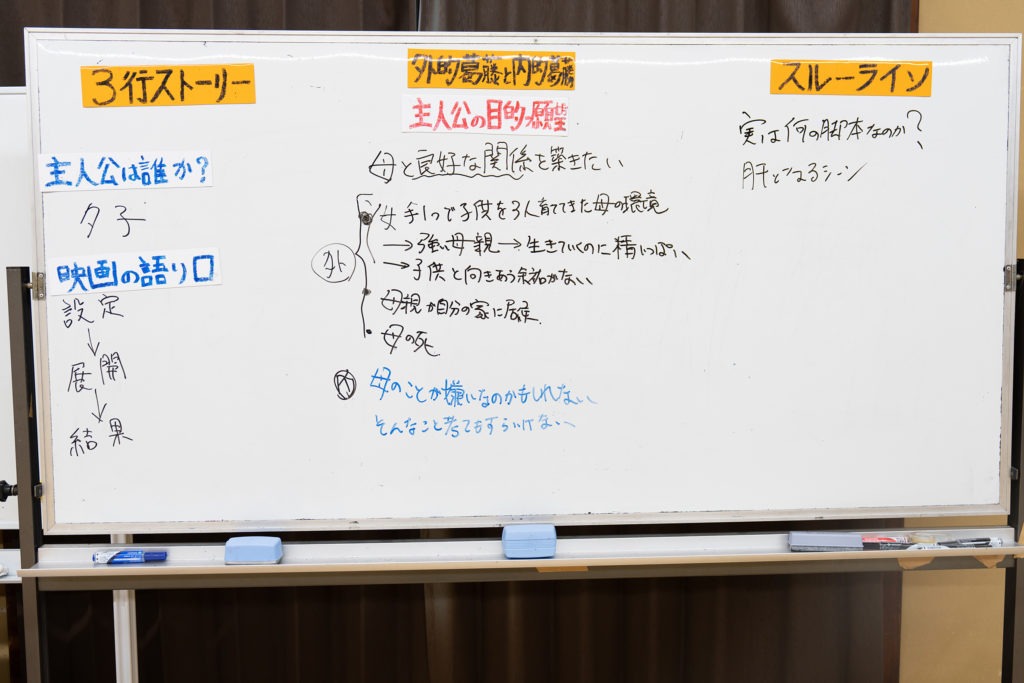 人物の目的から、その目的を達成させるのを邪魔している外的葛藤と内的葛藤を考え、この物語の中で一番大事なシーンは何かを読み解き、芝居へと移った。芝居の課題は主人公の夕子と妹の晶子が、昔の母との思い出話をするシーンと、夕子が母と言い合いになった後に、旦那の信二が夕子を慰めるシーンに分かれた。
